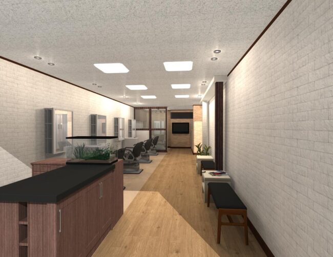 サロンの外観デザイン・内装のデザイン・設計・施工を担当させて頂きました。 外観は、ナチュラルなイメージで漆喰の塗り仕上げにしました。 内装は、3Dパースを作成し、イメージ通りの仕上がりになり、大変ご満足頂けました。 受付…